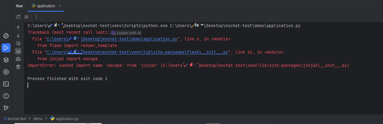 버전 맞추고 다시 실행. 이제 이게 무한 반복인데요. jinja2 버전을 맞추고 실행하니 markupsafe가 문제랍니다.