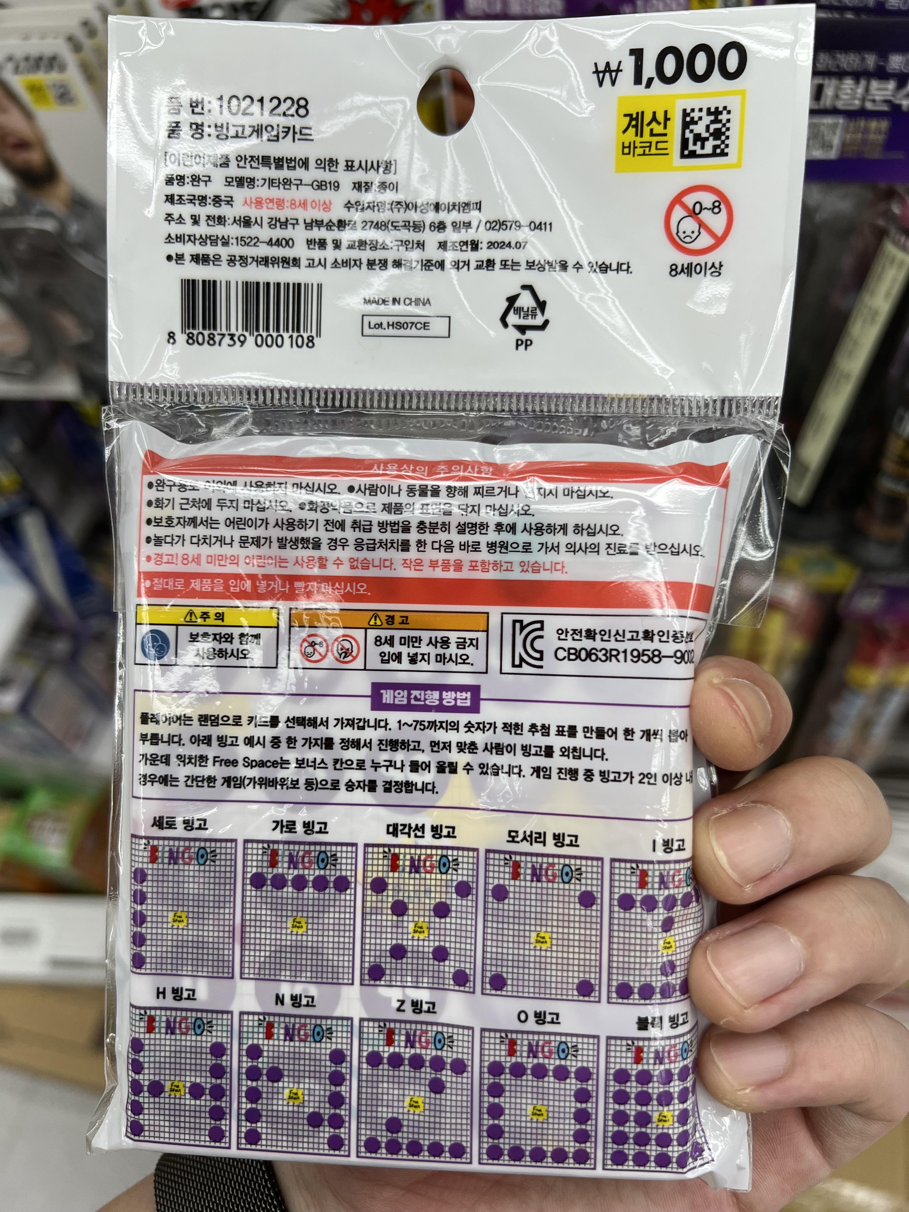 그리고 포장지 위쪽에 보면 간단히 접어서 라는 문구가 있는데 사진에 보이는 것처럼 빙고판의 숫자를 위로 들어 올릴 수 있게 되어 있습니다. 그래서 펜 없이 빙고를 할 수 있는 거죠.