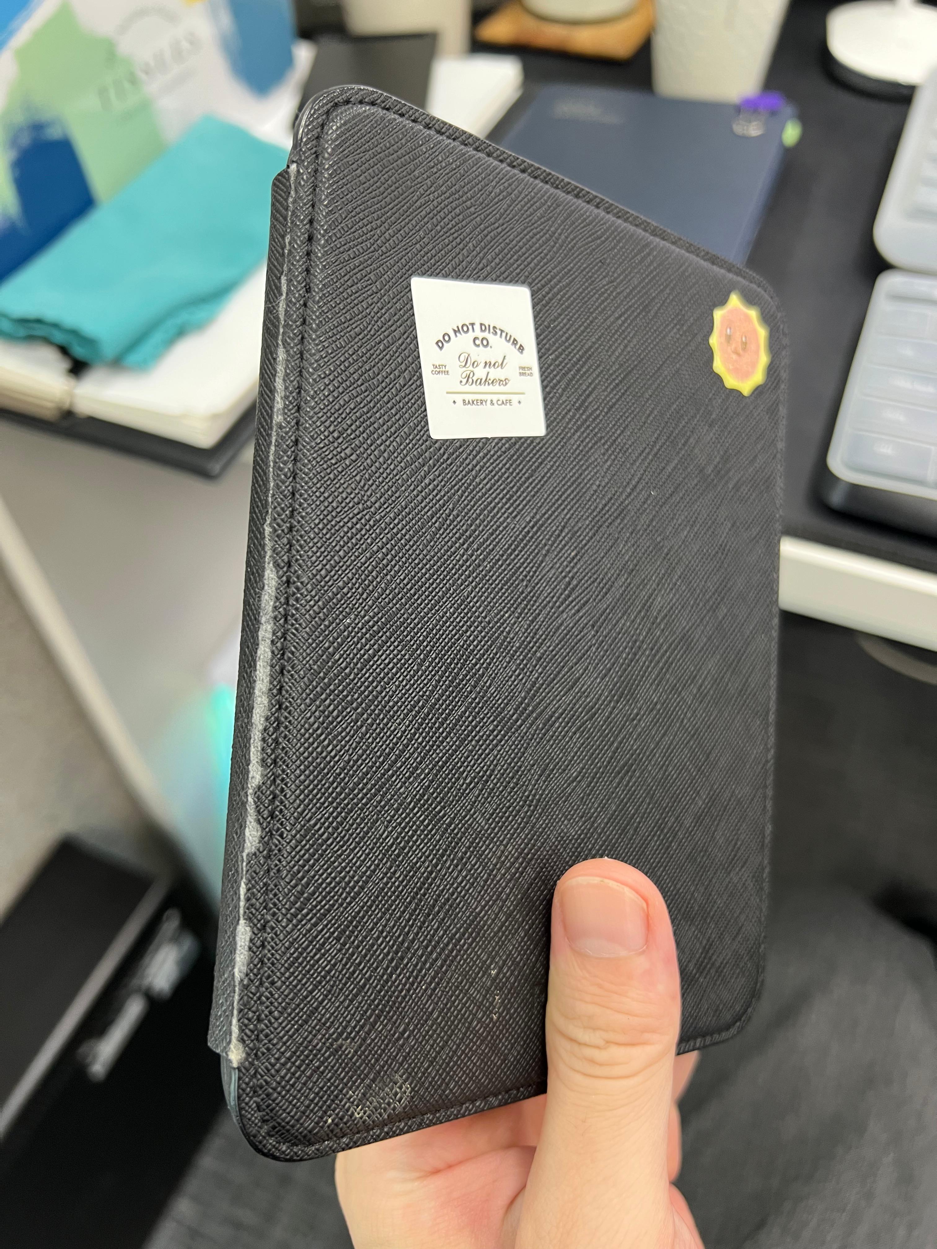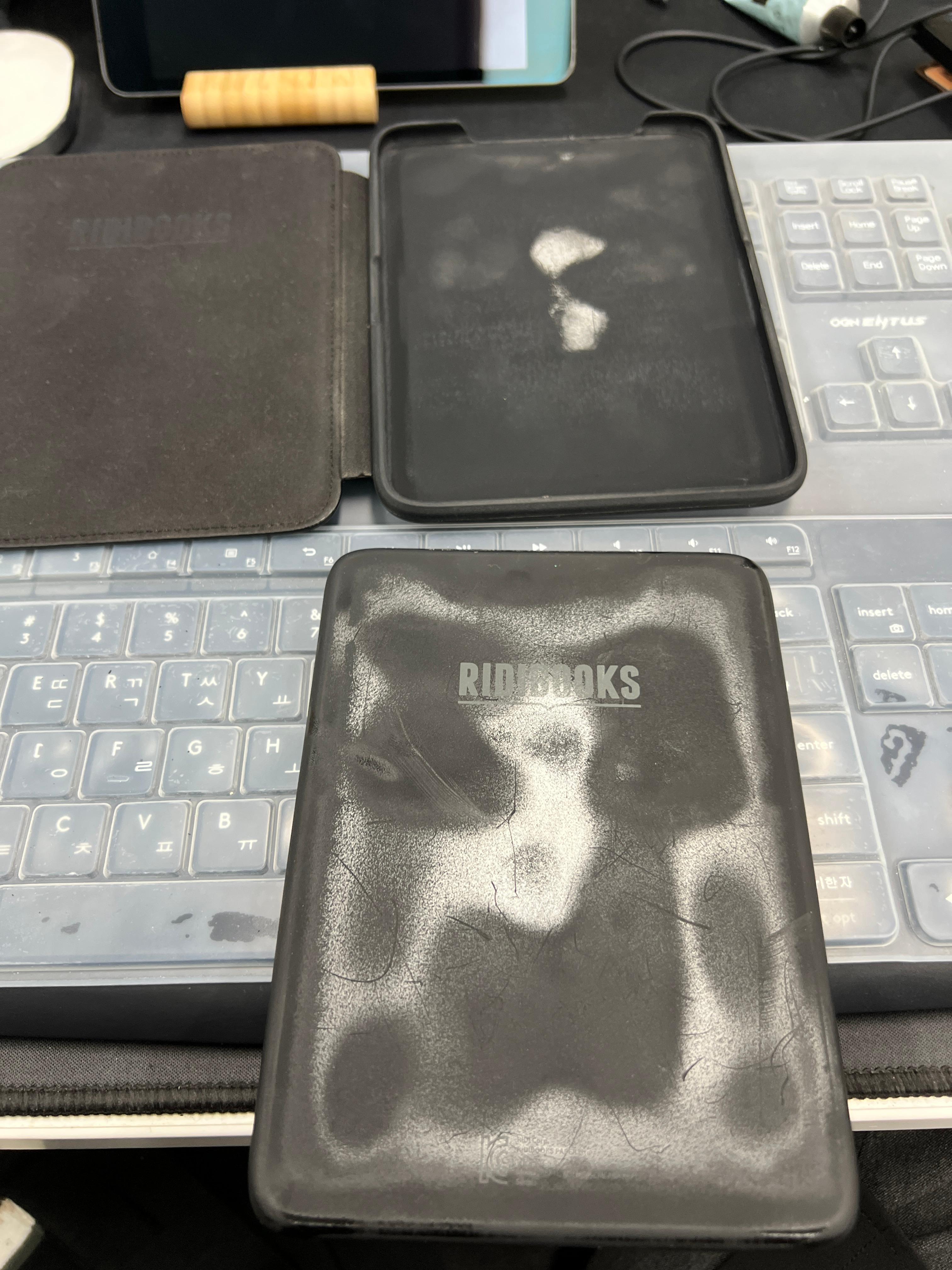 그래서 충전해서 나름 사용하고 있었는데.. 위 사진 처럼.. 저 가죽케이스가 이제 너무 다 닳아서 가루가 막 흩날립니다. 그래서 오늘 이제 케이스 빼고 쌩으로 써보자!라고 하고 케이스를 깠는데..