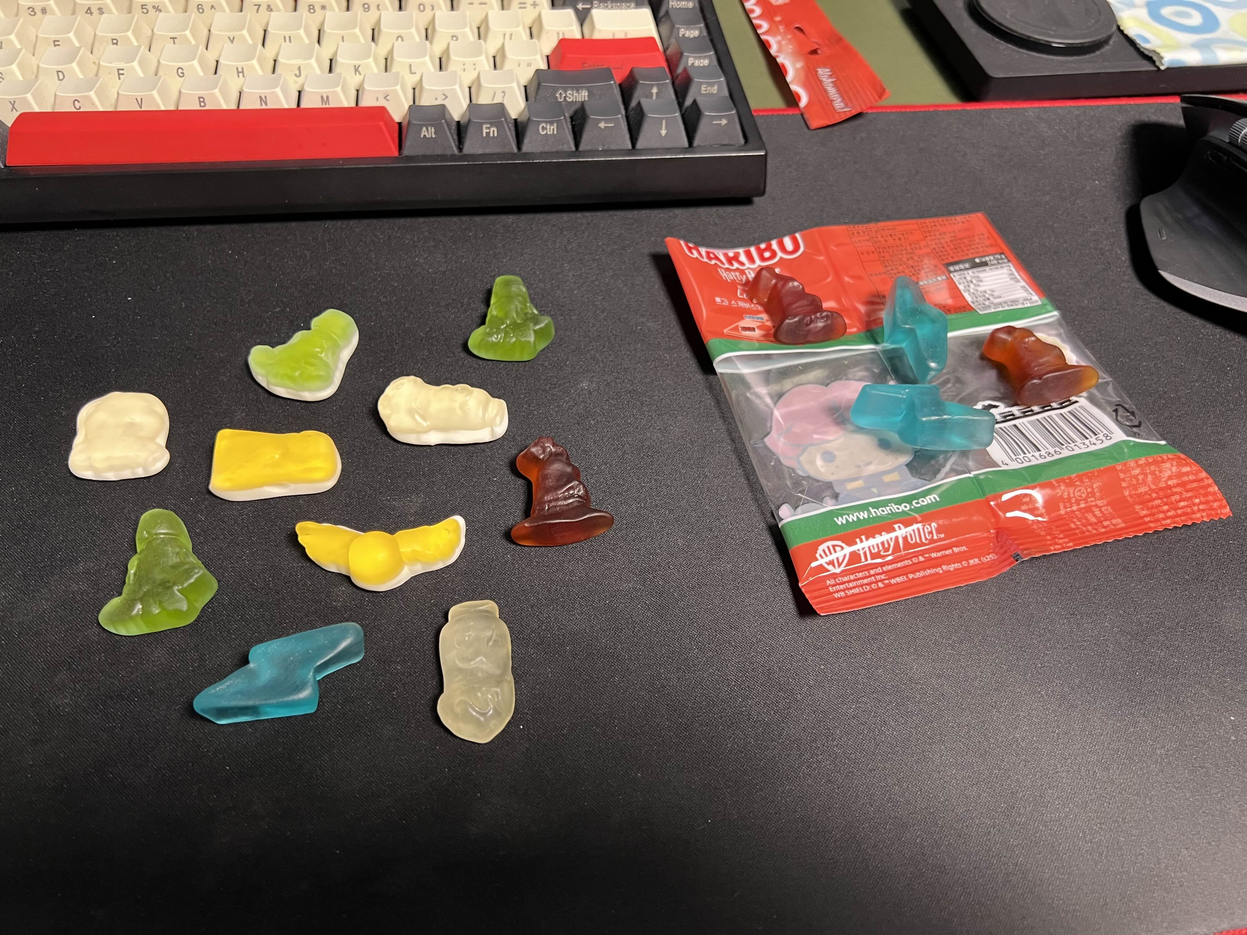 해리포터 젤리라서 랜덤 맛일 줄 알았는데 (코딱지맛 이런거??) 그런건 아니고 그냥 일반 젤리 맛인데요. 맛이 에매하더라고요. 그리고 젤리치고 식감도 쫀득도 아니고 말랑도 아니고 그 사이의 어떤 에매한 지점에 있는데 그게 하필 그렇게 매력적이지 않은 식감인 느낌..? 한번 더 사먹을 것 같진 않네요. 그냥 원래 있던 오리지널 하리보를 사먹는게 맛도, 양도 더 나은 선택지일 것 같습니다~~