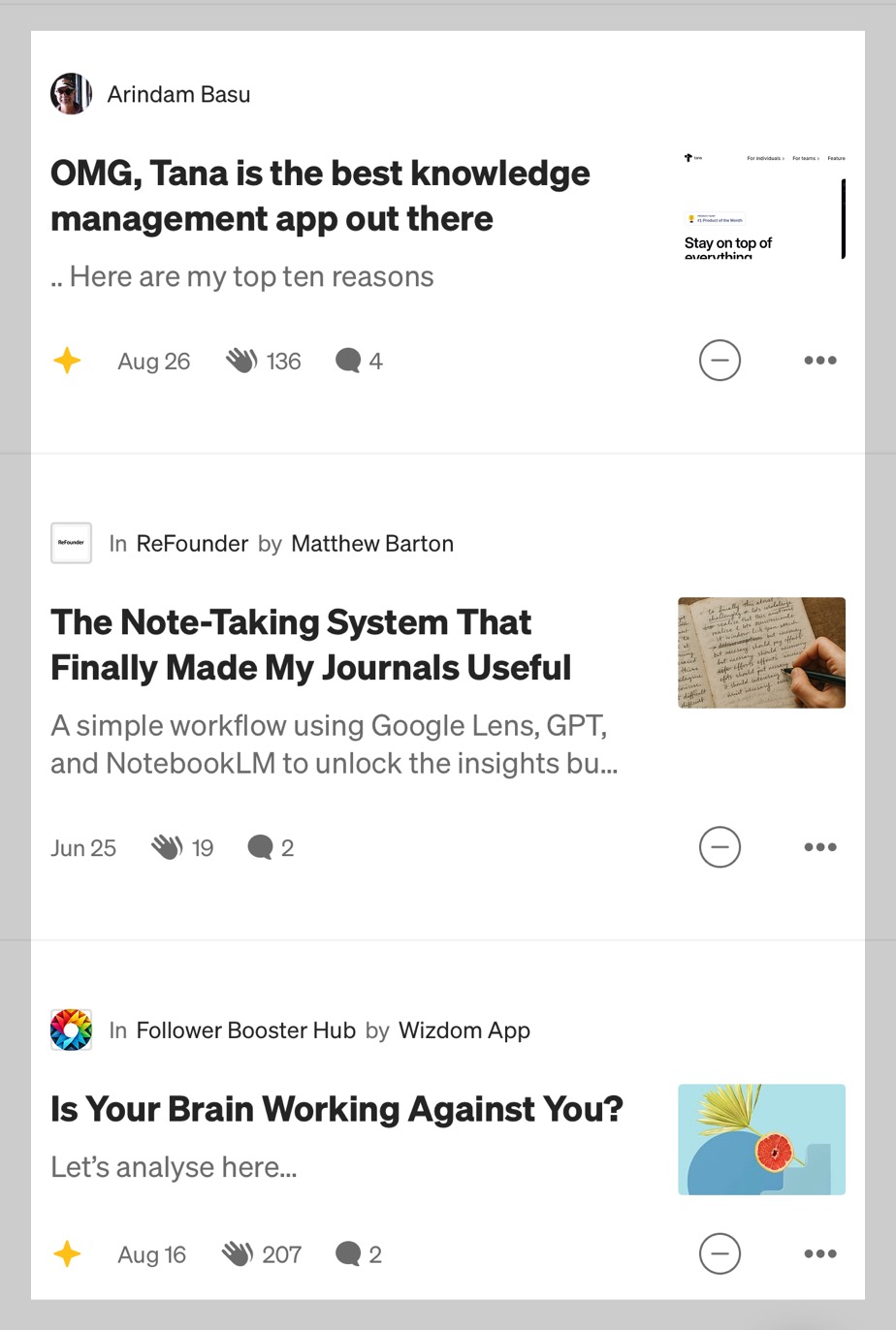 제가 저런 종류의 글을 몇번 보고 관심 카테고리에 넣어놔서 그럴 수도 있지만 일단은 생산성이나 앱, 아이티 관련 글들이 나오는데요.