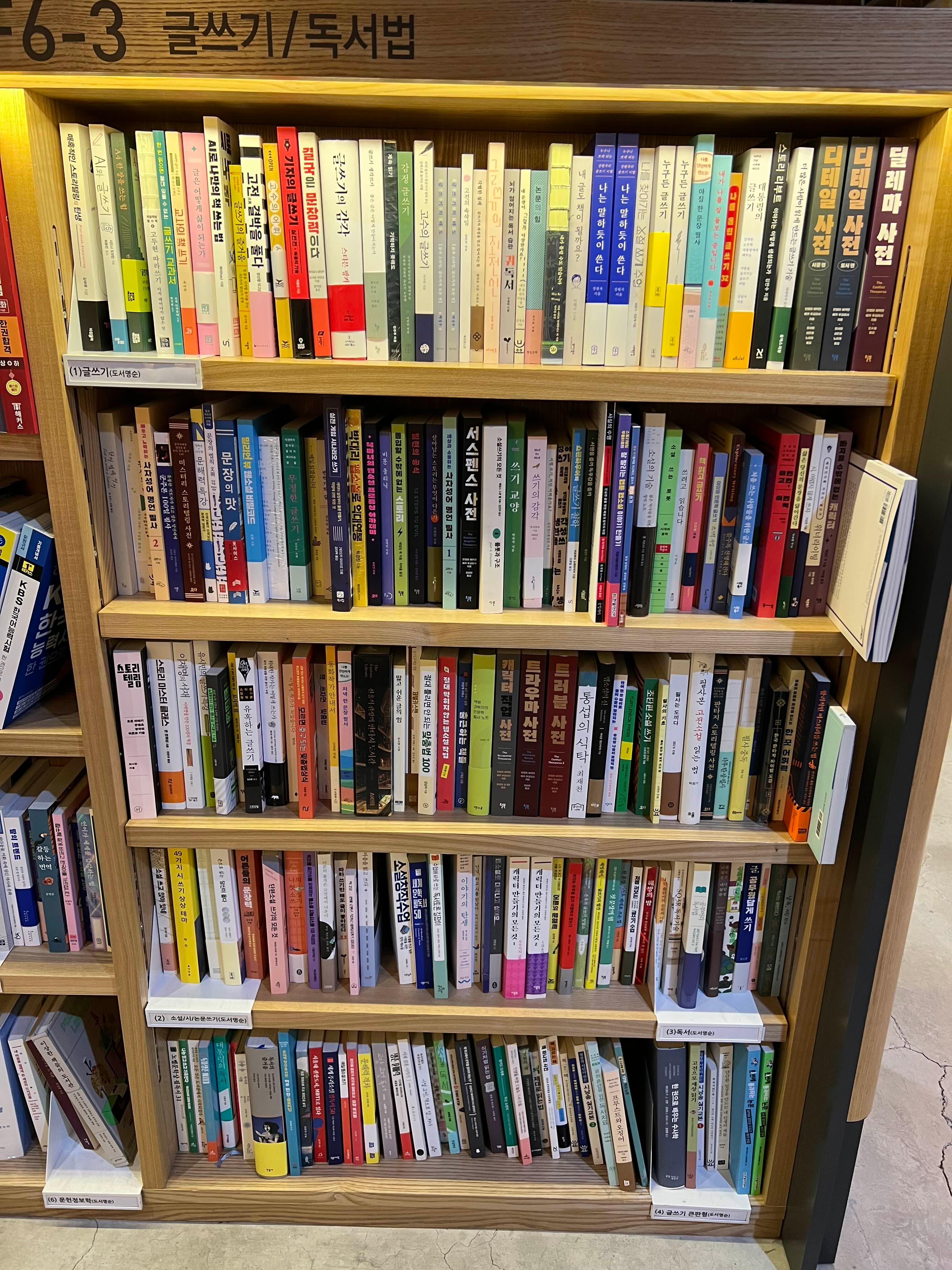 블로그를 쓰고 있지만 글쓰기에 대한 공부는 딱히 받은 적이 없는 것 같다. 상상력 같은 건 없는 편이라고 생각하지만 괜시리 소설도 한번 써보고 싶기도 하고. 그래서 일단 글쓰기 코너에 가봤다. 근데 막상 가봤는데 너무너무 책이 많아서 뭐부터 봐야 될지 모르겠어서 몇권 훑어본 뒤에, 구역 전체만 찍어놨다. 글쓰기는 우선 블로그를 좀 야금야금 적으면서 저런 책들은 한두권씩 읽어봐야겠다.