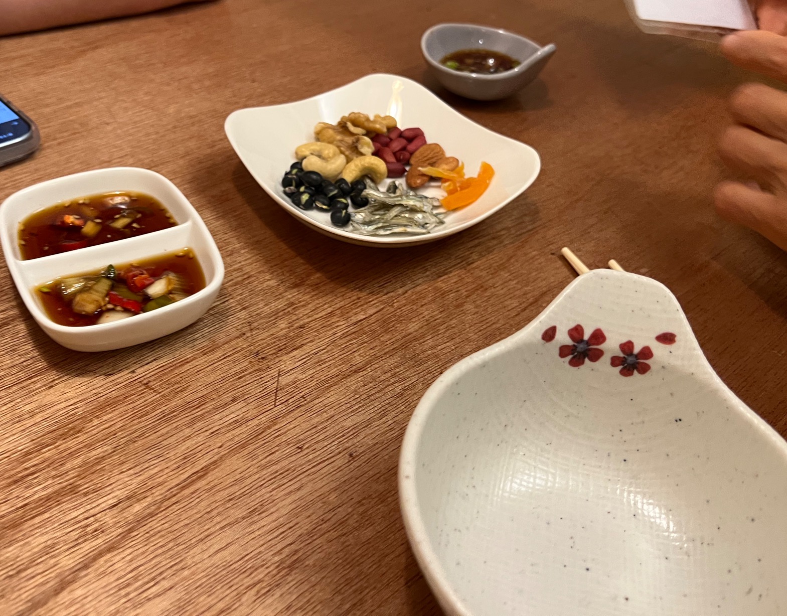 오뎅을 찍어먹을 간장과 각종 견과류들이 들어있는 접시가 있습니다.